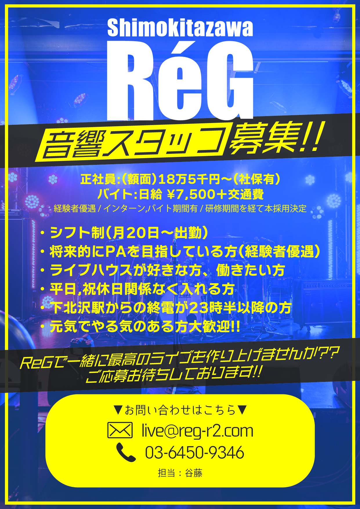 ライブハウス下北沢ReGでは音響スタッフを募集中です!!